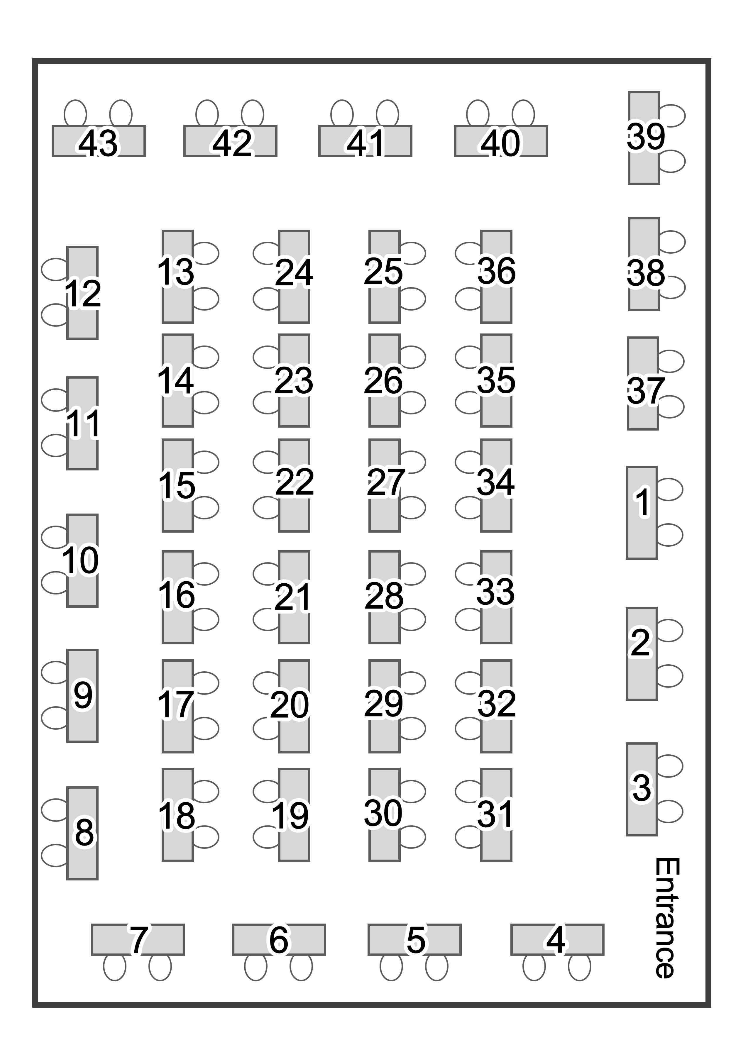 Use the table map below to find a space you would like. Spaces are not reserved until payment has been received.